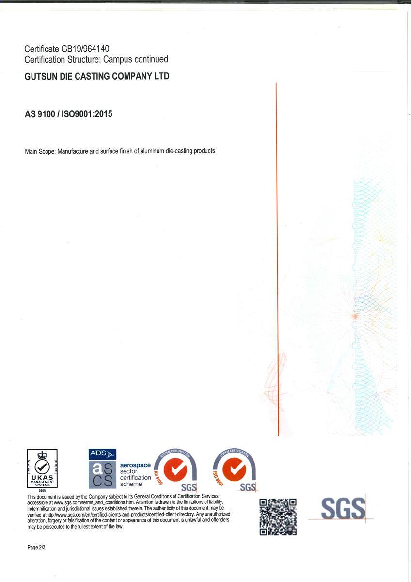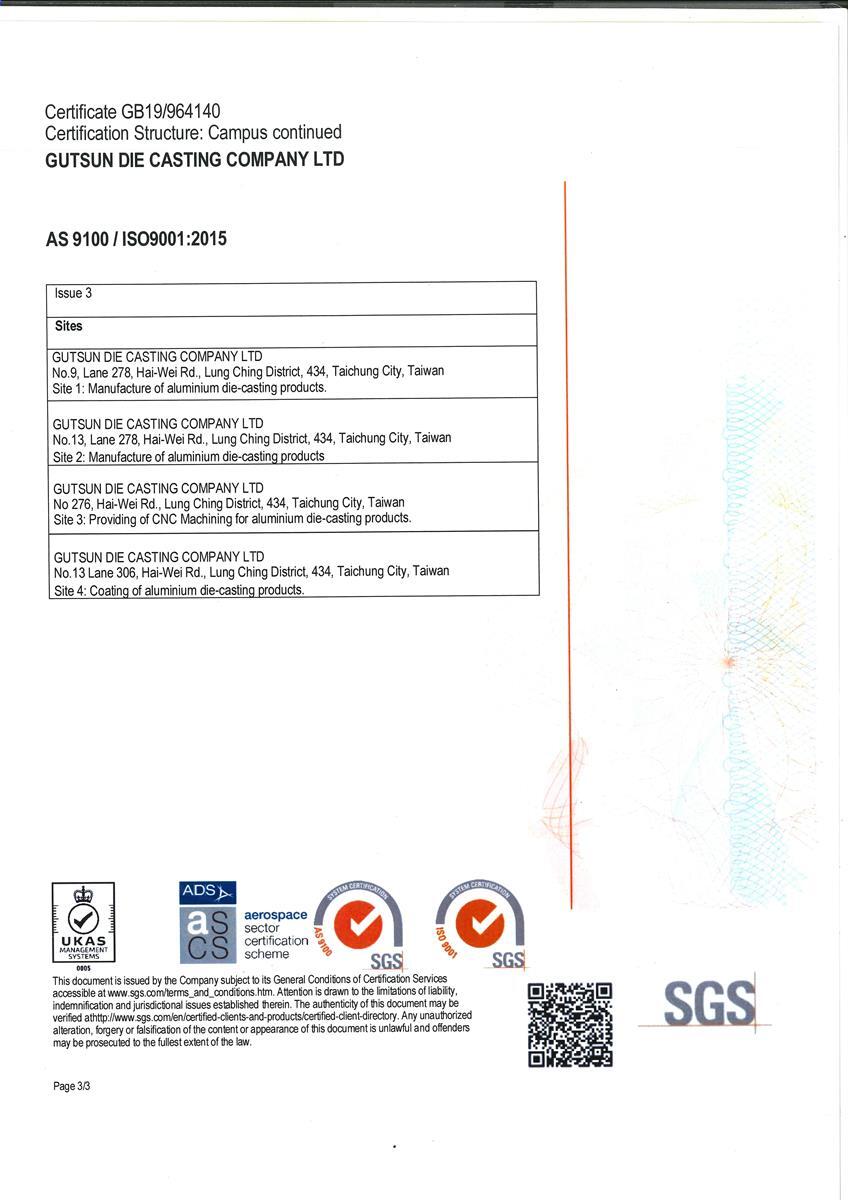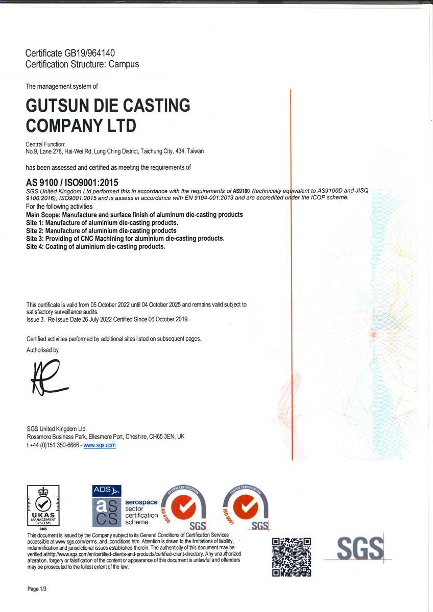 依照各別產業不同的要求,我們通過了ISO 9001:2015、國際汽車品質管理系統IATF 16949:2016以及航太品質管理系統AS 9100D的認證,提供客戶品質優良且穩定的鋁合金壓鑄產品,提昇客戶滿意度。