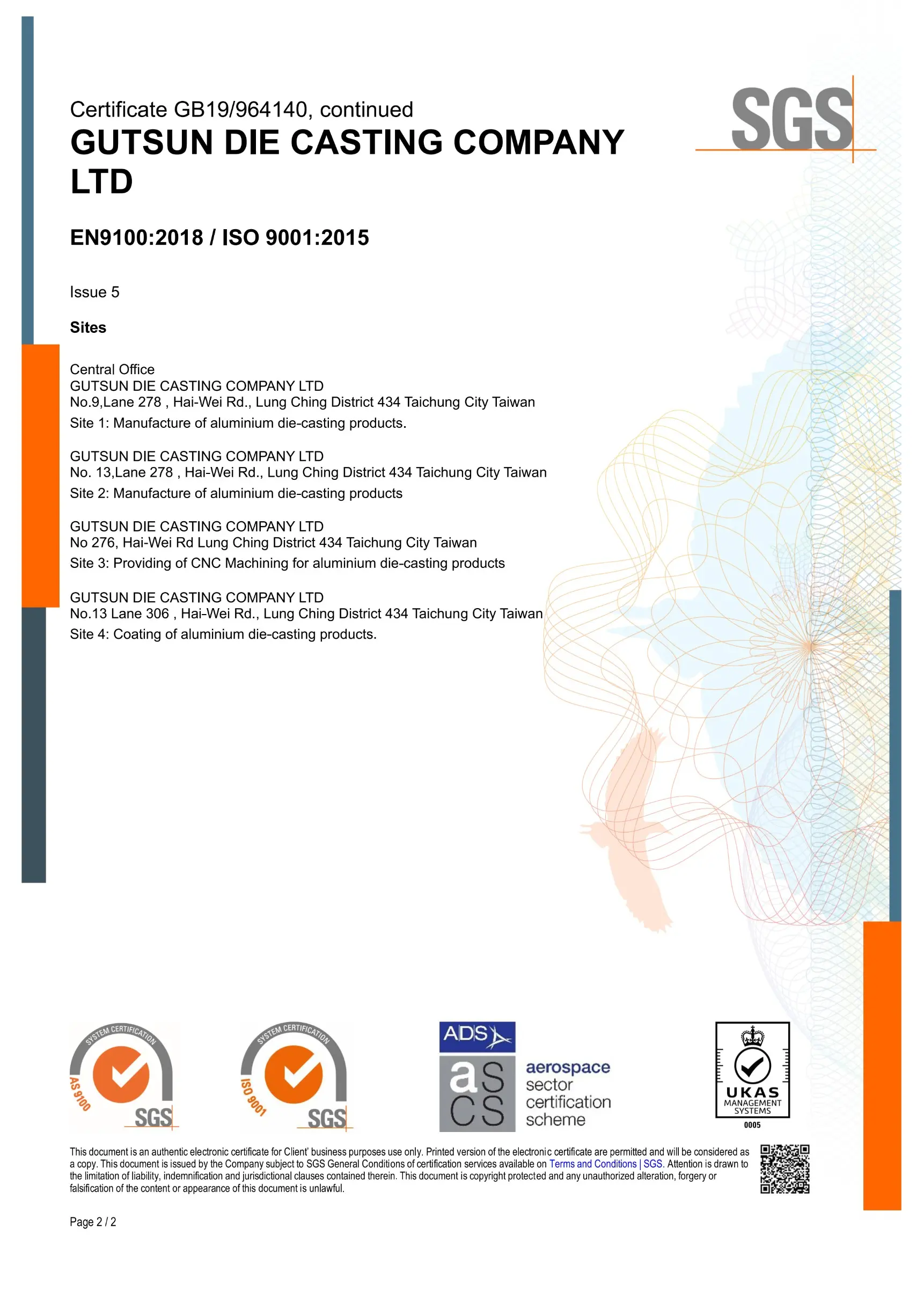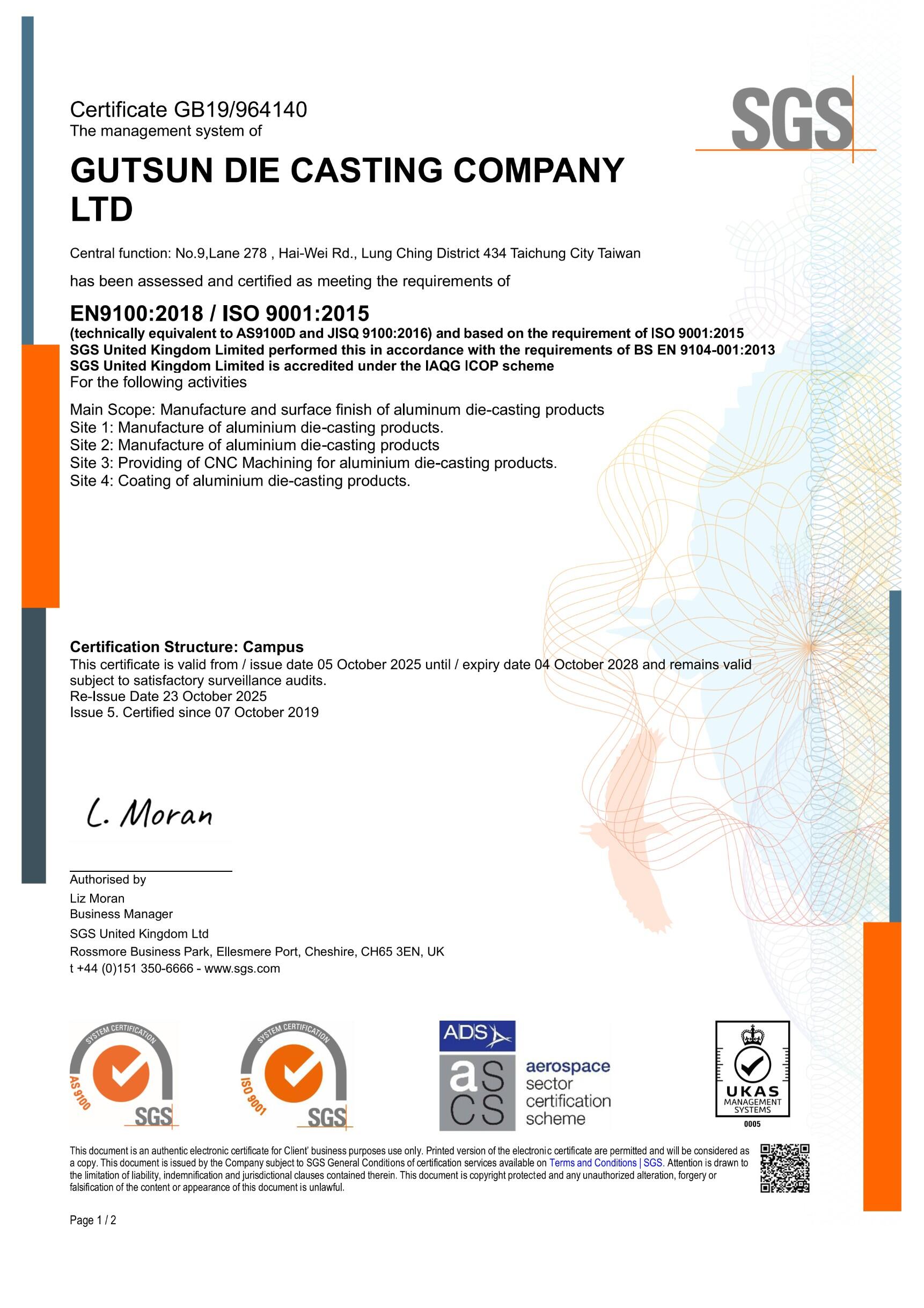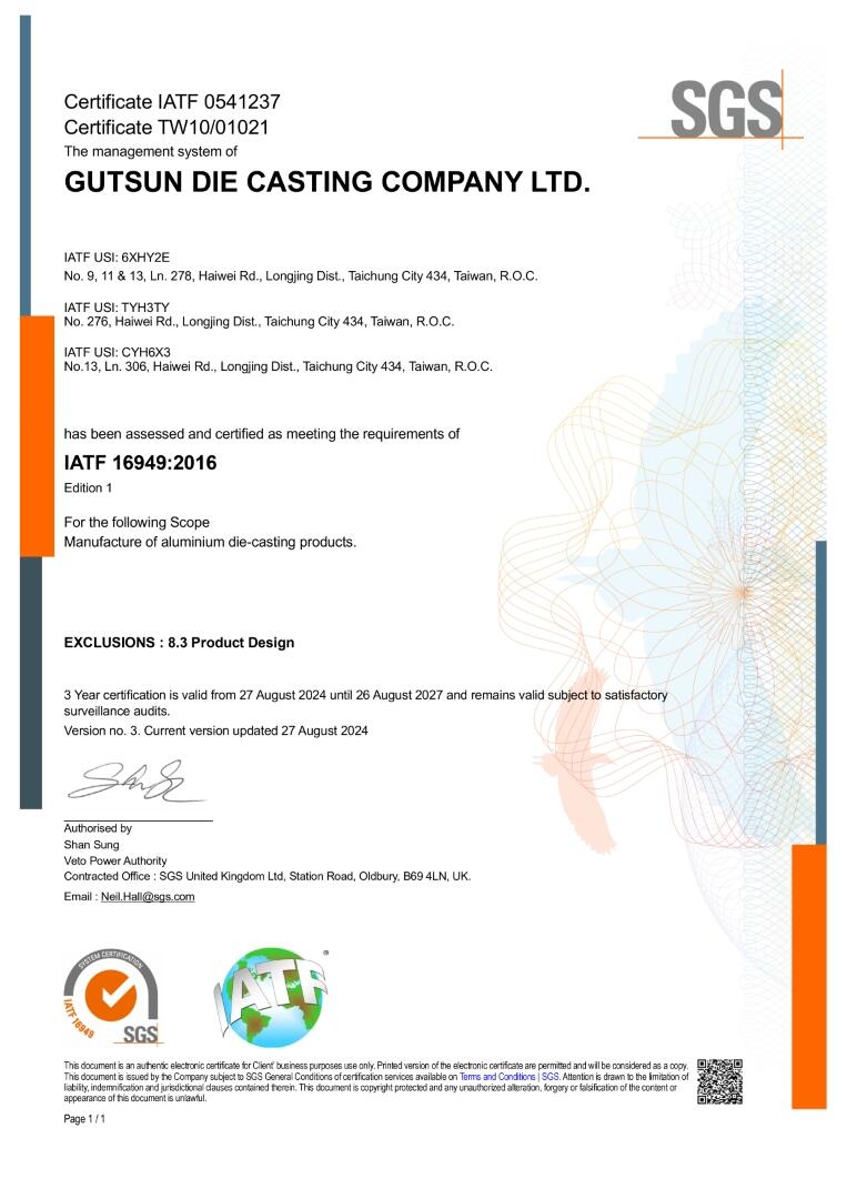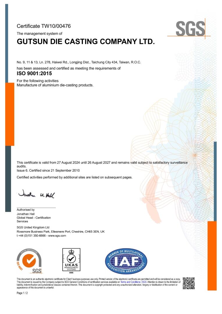 依照各別產業不同的要求,我們通過了ISO 9001:2015、國際汽車品質管理系統IATF 16949:2016以及航太品質管理系統EN 9100D的認證,提供客戶品質優良且穩定的鋁合金壓鑄產品,提昇客戶滿意度。